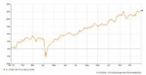 At the end of a strong year for global equities, on New Year’s Eve, the FTSE 100 closed up 21.5% compared with the start of January 2025.